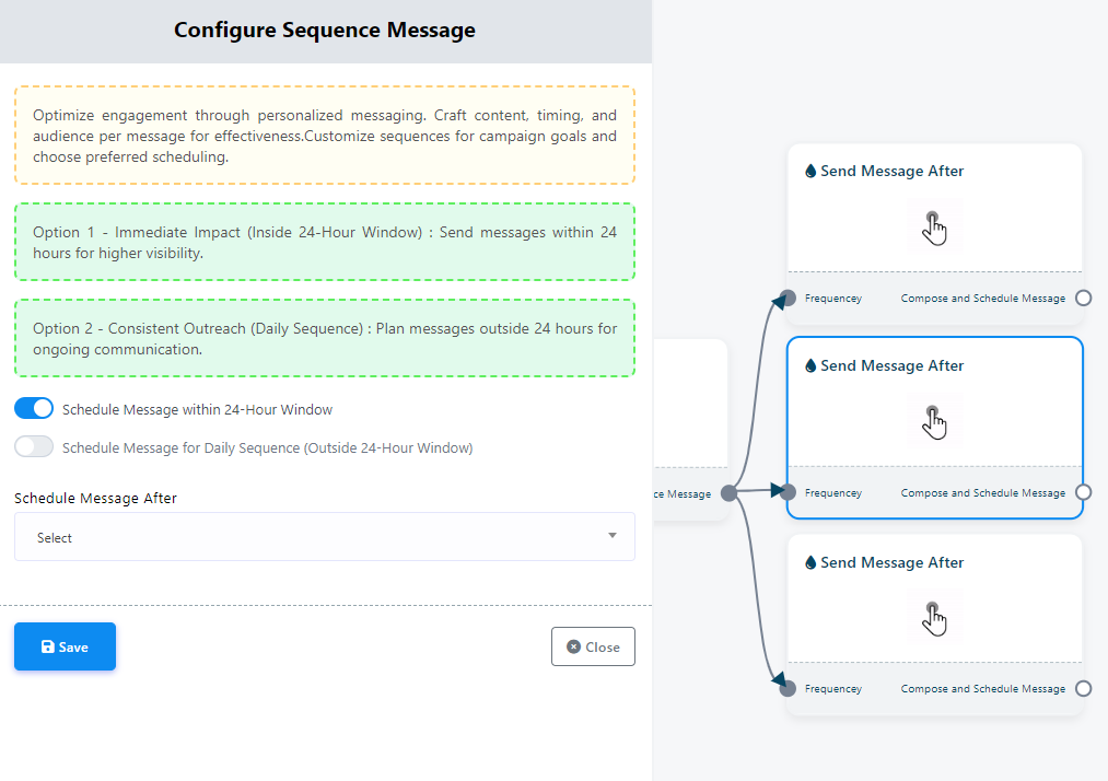 In practical terms, it allows you to configure a series of messages that are sent at precise time intervals, ensuring that communication with users remains timely and contextually relevant.